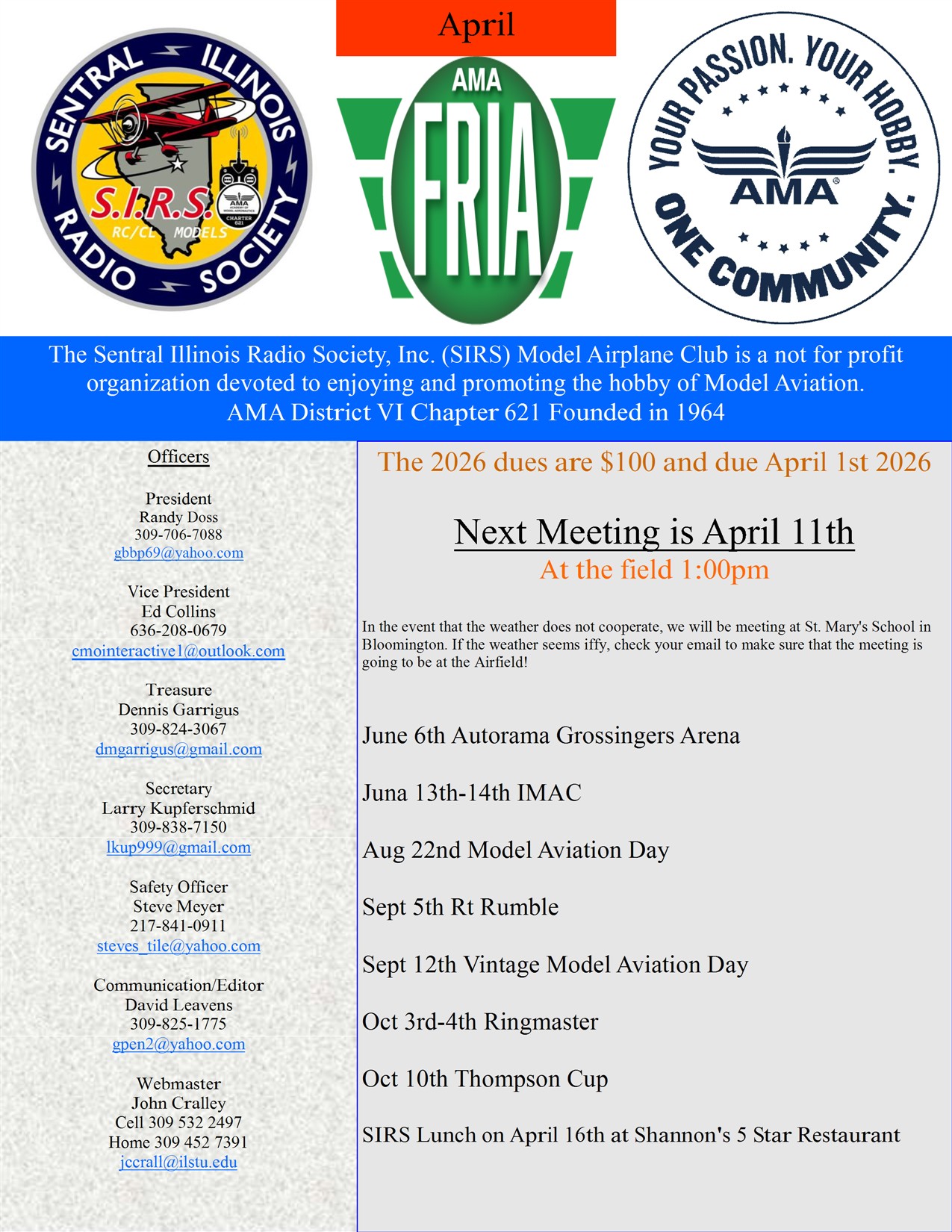 Sentral Illinois Radio Society AMA District VI Chapter 621 Founded in 1964